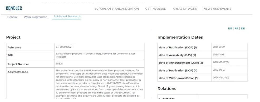 2022年3月27日,欧洲CENELEC发布激光产品的辐射安全标准 EN 50689:2021 Safety of laser products — Particular Requirements for Consumer Laser Products,新标准于2022年9月27日开始采用,在2024年9月27日后强制实施。